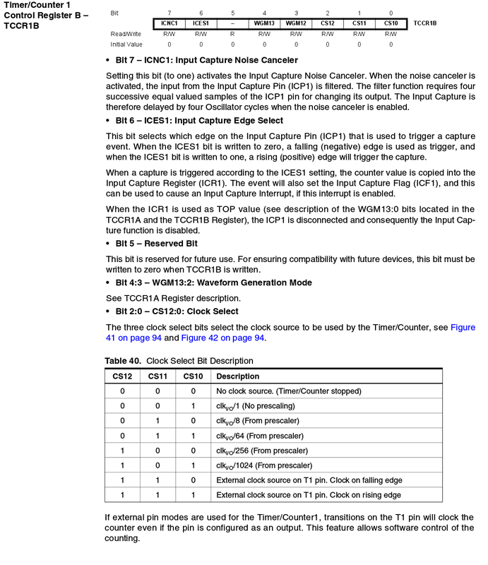 Здесь общий для всех таймеров TIMSK, составнной регистр счетчика TCNT1H:TCNT1L, составной регистр прерывания захвата ICR1H:ICR1L и контрольный регистр TCCR1B.