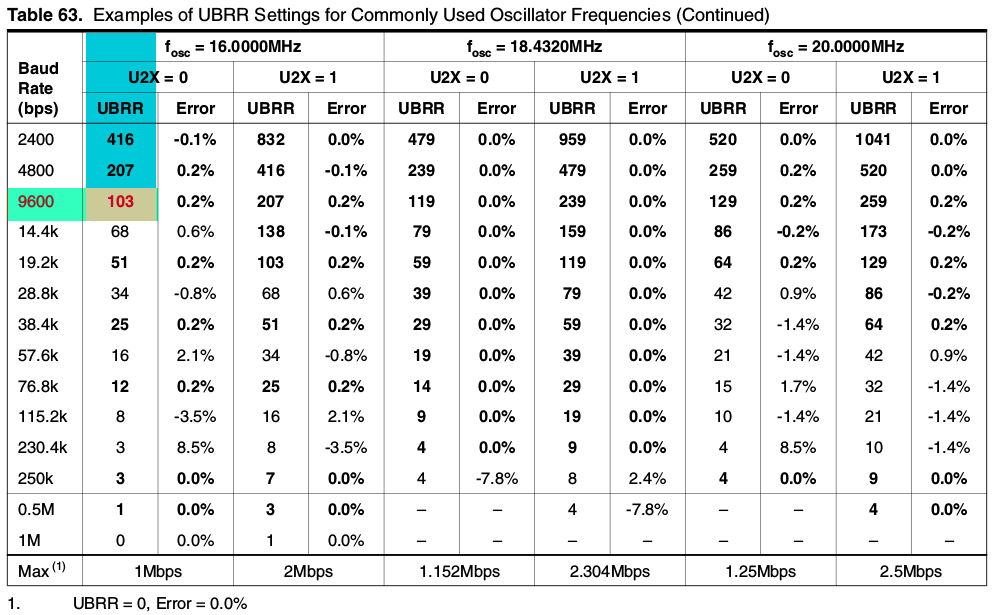 .т.е. для 16МГц кварца и битрейта 9600 будет: 16000000/(16*9600)-1 = 103.1(6)